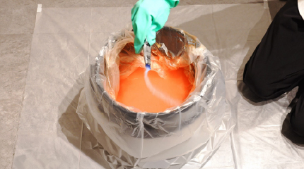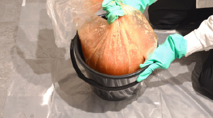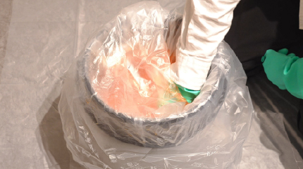 成分の流出を防ぐため、バケツ内の水に凝固剤を投入し、しっかりとゼリー状に固めます。 刺激成分が含まれているため、固める際も肌に触れないよう注意して作業を行ってください。