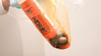 スプレー缶をバケツの水の中に完全に沈めます。腕を通していたポリ袋を裏返しながら、バケツ全体を包み込むように被せてください。